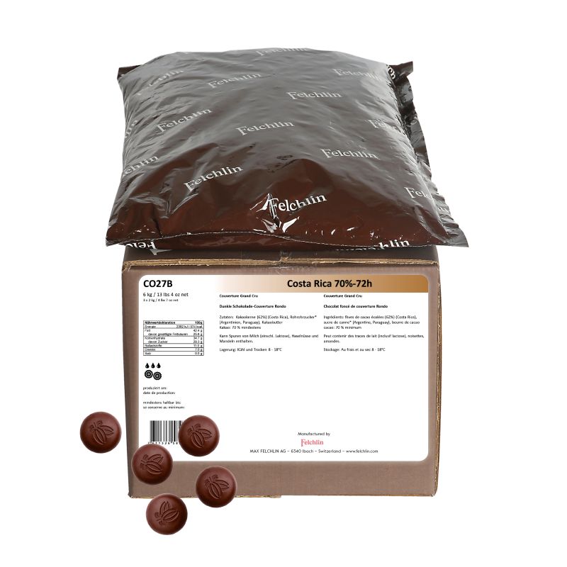 Declaration: cacao kernel (62%) (Costa Rica), cane sugar* (Argentina, Paraguay), cacao butter cocoa: 70 % minimum * from organic farming