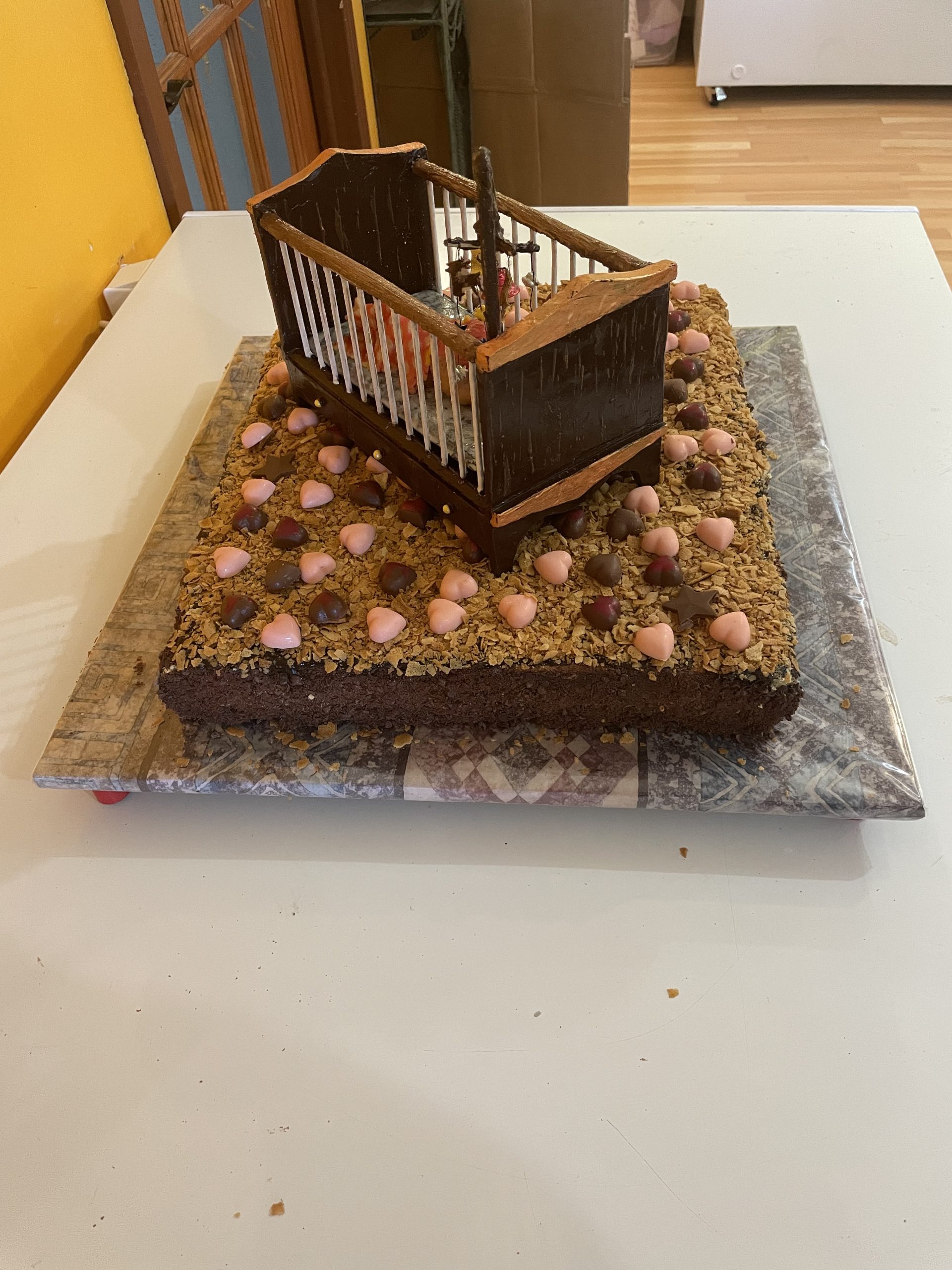 This baby crib is entirely made rom chocolate for a mother shower .